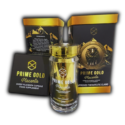 What is Prime Gold Placenta? Prime Gold Placenta is a premium food supplement made from pure Sheep Placenta (ovine placental extract) enhanced with clinically studied ingredients such as stem cell boosters, marine collagen, powerful antioxidants, and other bioactive compounds. Each capsule contains a concentrated 500mg formula designed to support the body’s natural regeneration and overall vitality.